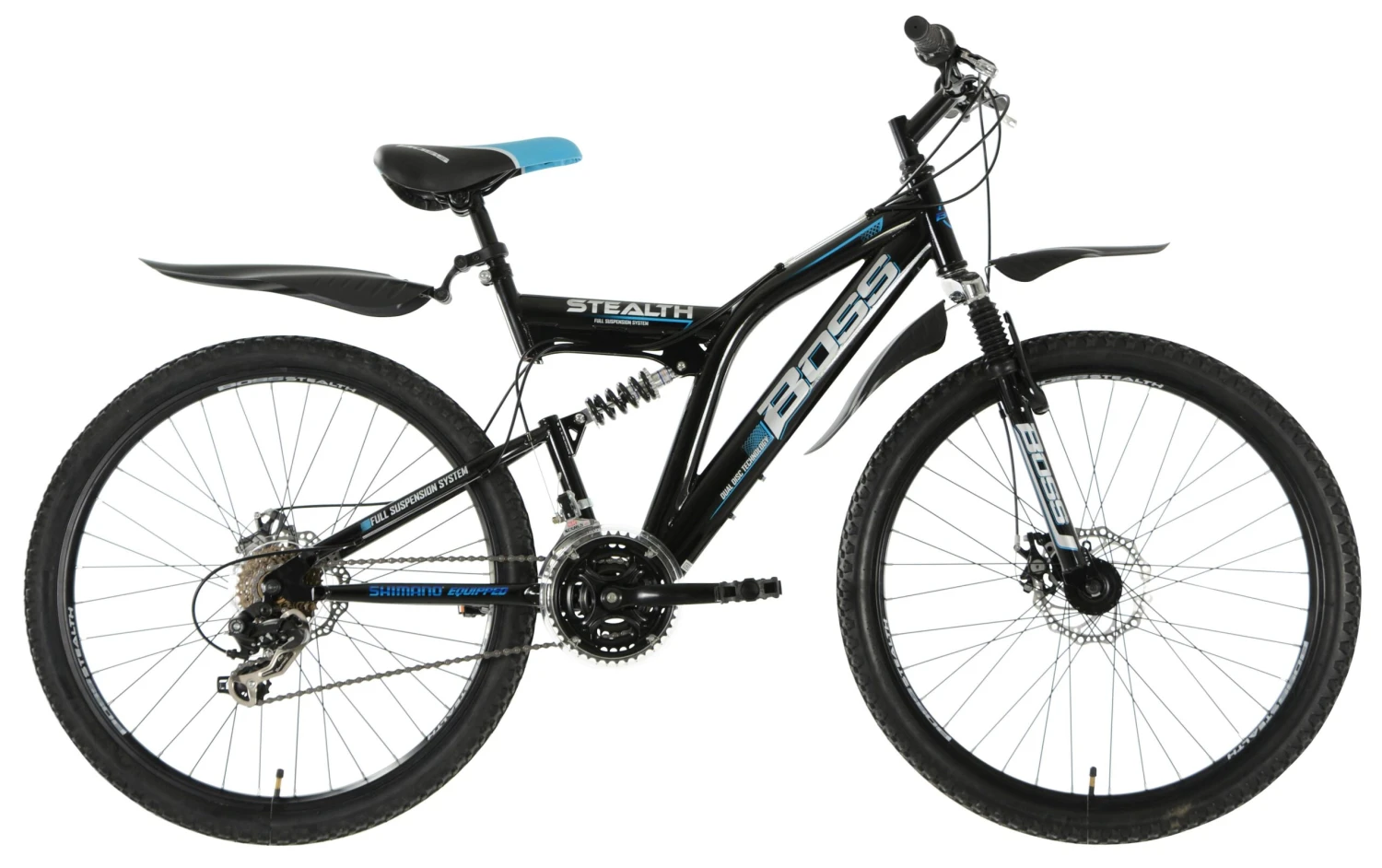 The Boss Stealth Men's Mountain Bike certainly looks like it means business, and that's exactly what its specs say about it, too. Off-roading is no problem on the Stealth thanks to its full suspension, 21 speed Shimano gearing and powerful mechanical disc brakes which can be relied upon in any and all conditions.
