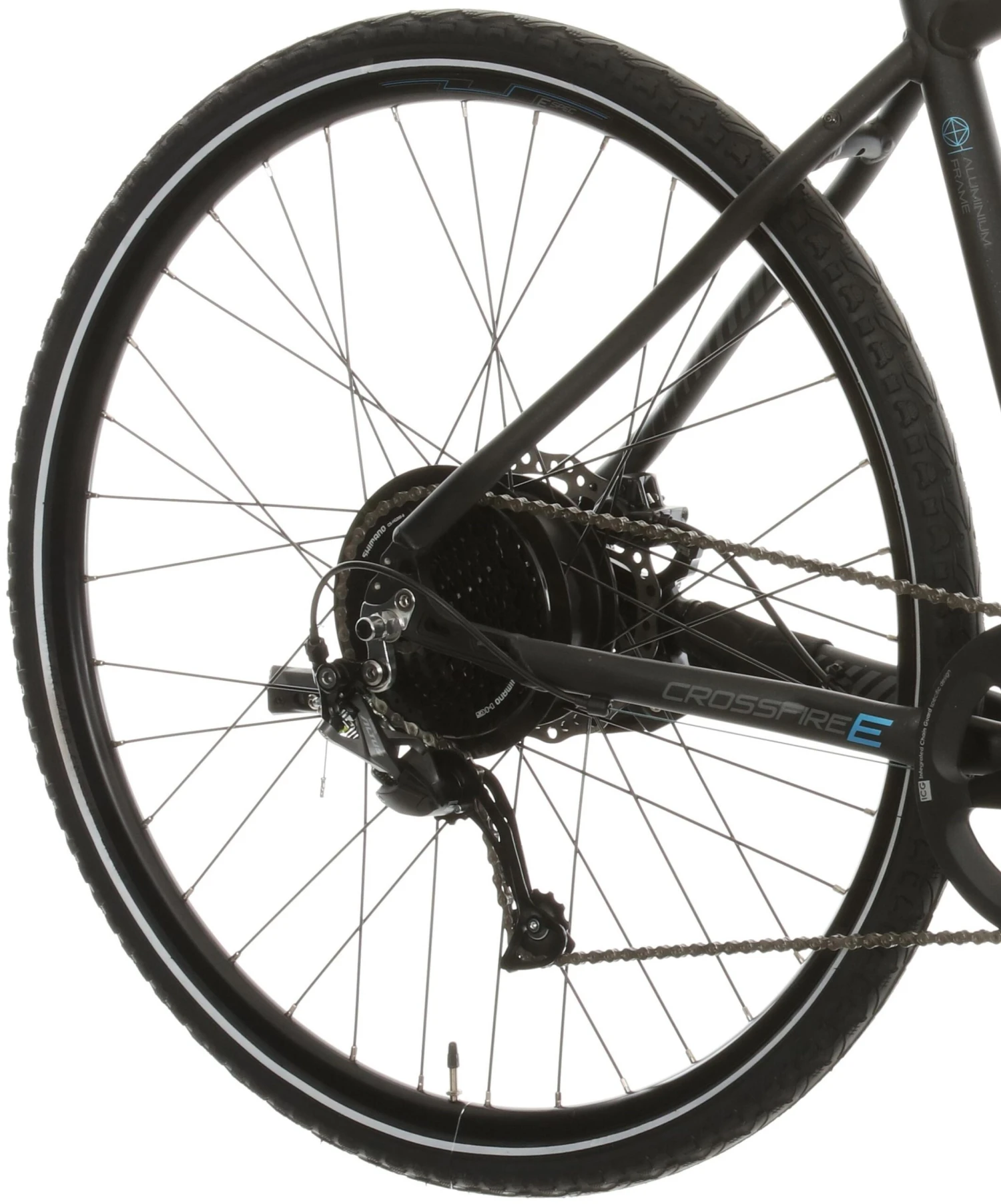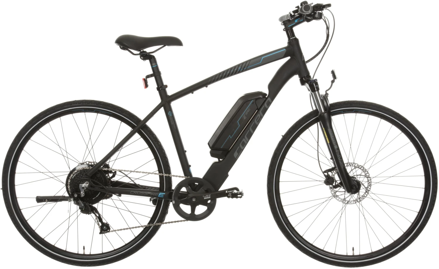The Carrera Crossfire E features smooth shifting Shimano 9 speed gears with a single chainring on the front allowing for hassle free shifting.