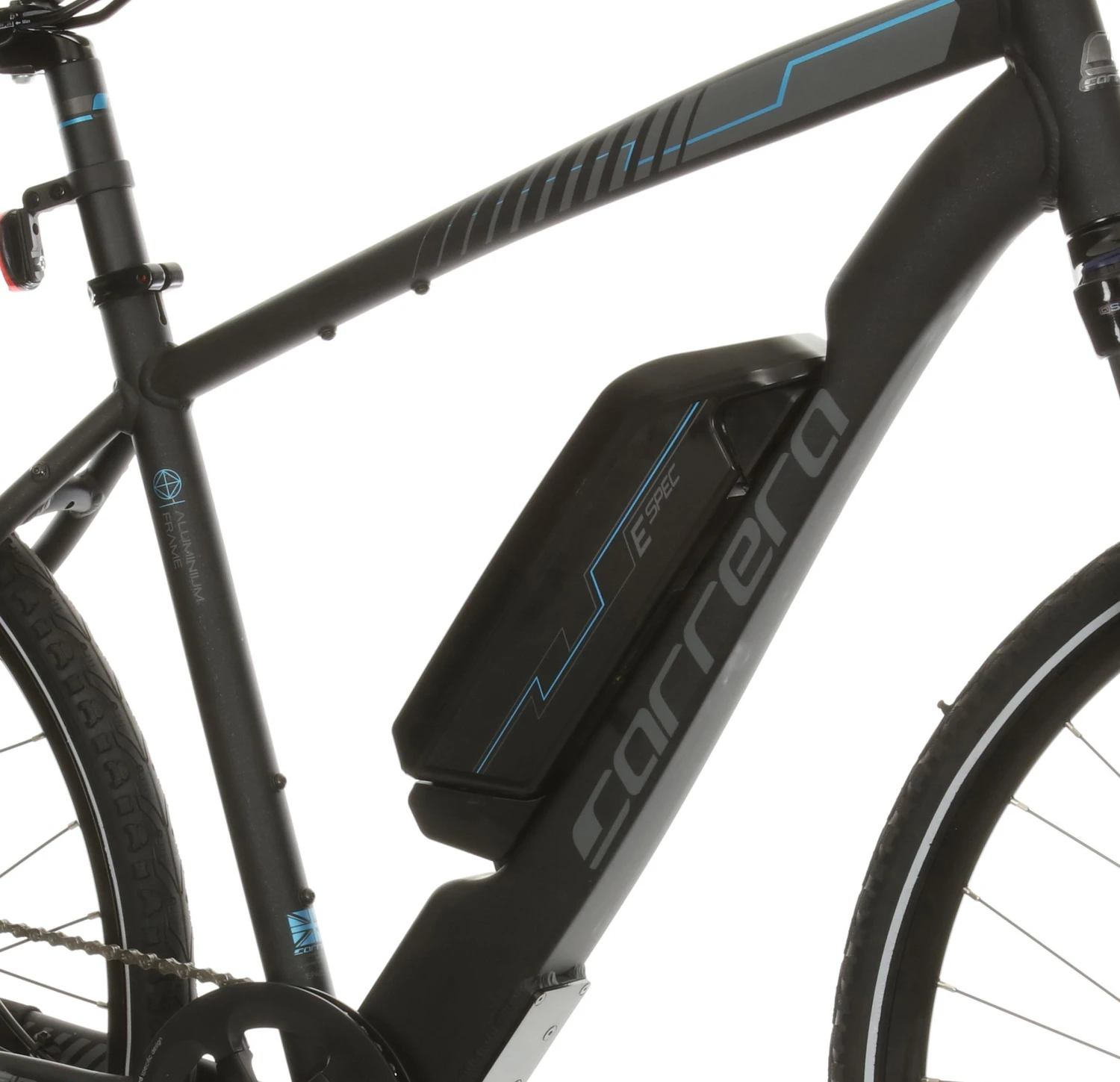 The Carrera Crossfire E boasts a 417Wh battery with an average range 25-30 miles (max 60 miles)* of riding time on a single charge.