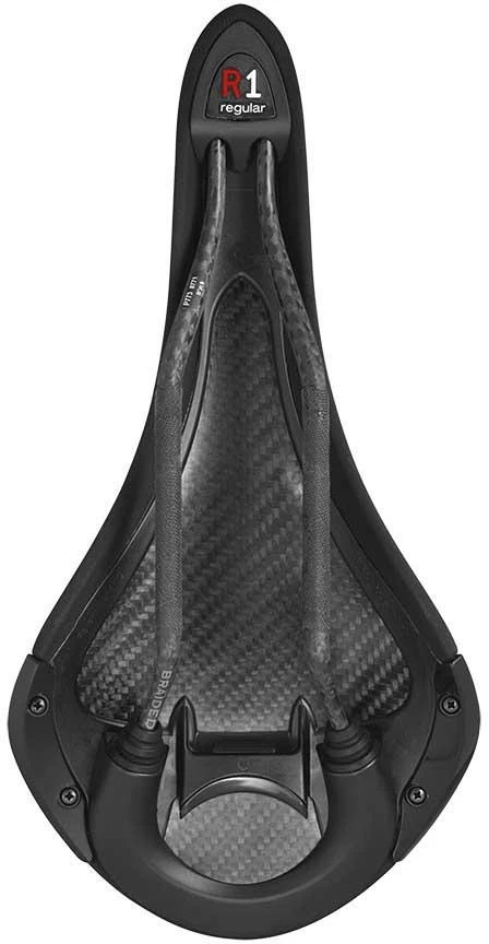 A carbon bike saddle with a composite carbon co-injected nylon TwinFlex shell and a thermowelded black grippy microtex cover.