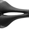 An ergonomic bike saddle with a central cutout to eliminate pressure on sensitive soft tissue; a carbon-reinforced nylon shell; and strong, lightweight, corrosion-resistant Kium rails.